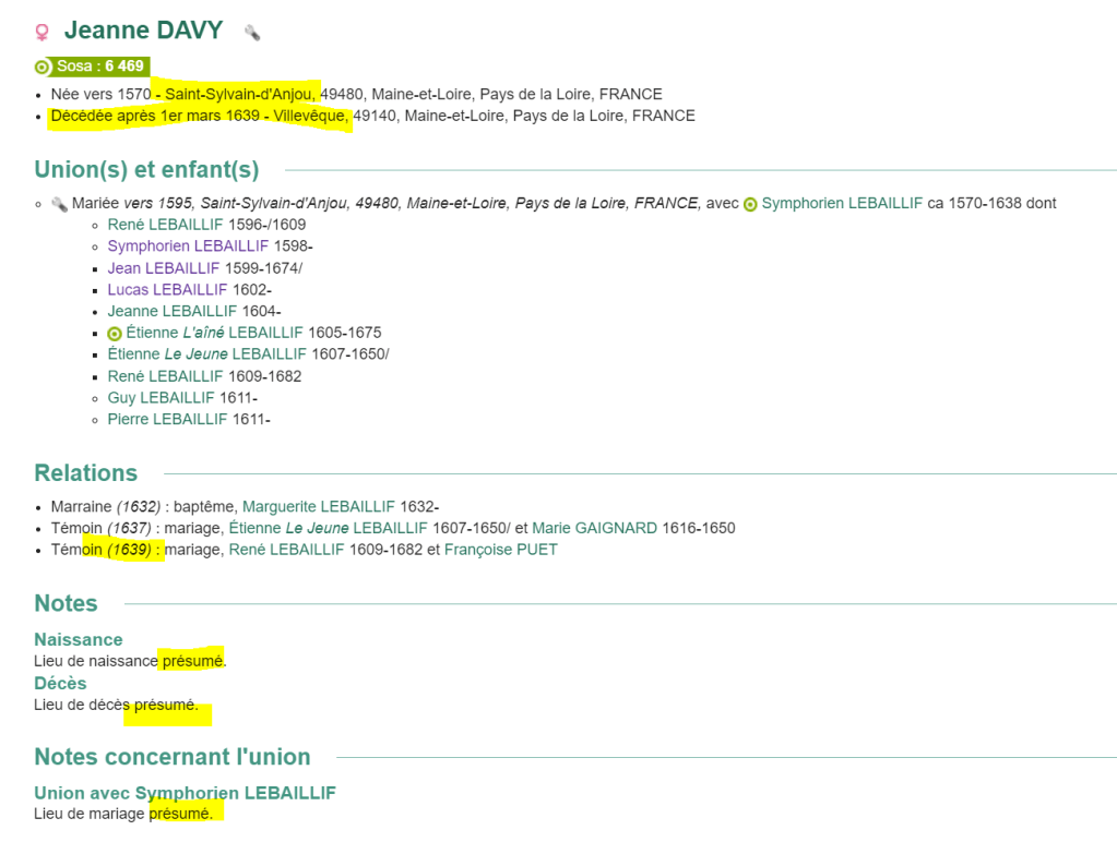 Cependant, en corrigeant cette anomalie, je me suis rendue compte que rien, sur la fiche de Jeanne DAVY, ne me permettait de savoir, au premier coup d’œil, d’où elle était originaire. Ce n’est pas bien grave, mais lorsque l’on a beaucoup d’ancêtres, parfois il est difficile de les situer rapidement. Je décide donc de lui ajouter un lieu de naissance et un lieu de décès hypothétiques.