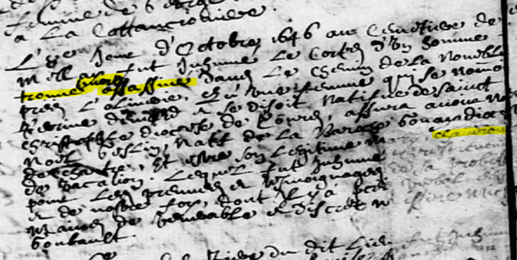 Le 8è jour d’octobre 1646 au cimetiere de Mellay fut inhumé le corps d’un homme trouvé mort assassiné dans le chemin de la Nouelle près l’Oliverie chez une femme qui se nommoit Perrine DEMARD (?) et se disoit natifve de Sainct Christophe, diocèse de Touries, assura avoir nom Noel GESLIN, natif de La Baroche Gouais[1], diocèse de Chartres et estre son légitime mari, chaudronnier de vacation. Lequel fut inhumé chrestienement pour les preuves et tesmoignages de sa probité et de nostre foy, dont il y a procès (?) verbal des mains de venerable et discret messire Michel GOUBAULT »