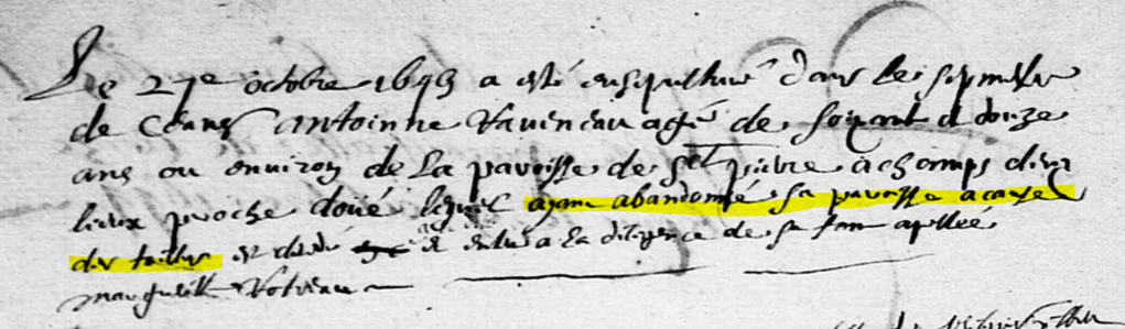 Le 27e octobre 1649 a esté ensepulturé dans le septmetiere de ceans Antoinne RAVENEAU agé de soixante et douze ans ou environ de la paroisse de St Pierre à Champs deux lieux proche Doué, lequel ayant abandonné sa paroisse à cause des tailles est décédé et enterré à la diligence de sa femme appellée Marguerite ROTREAU.