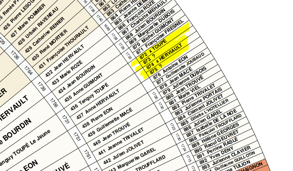 C’est donc nantie de ces éléments que je suis partie à la découverte de la table des naissances des TOUPÉ. J’ai reconstituée les fratries des différents couples ayant eu des enfants au cours des années 1685 à 1710.