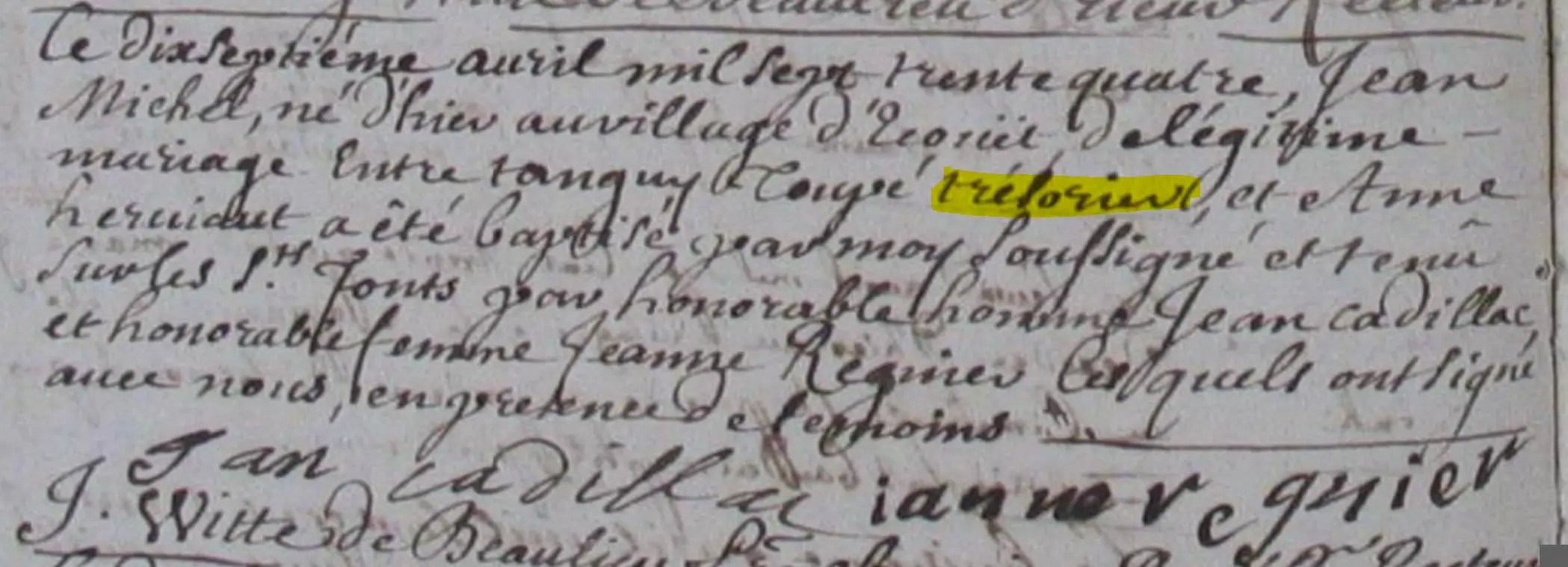 Les actes de baptêmes, voire de décès, des neuf enfants de Tanguy TOUPÉ sont malheureusement très pauvres en renseignements. Hormis les noms des parrains et marraines, on n’y trouve quasiment aucun lien de parenté, aucun indice susceptible d’aider à retrouver l’origine de Tanguy. Sa profession n’est non plus jamais précisée, à une exception près, où il est dit « Trésorier ».