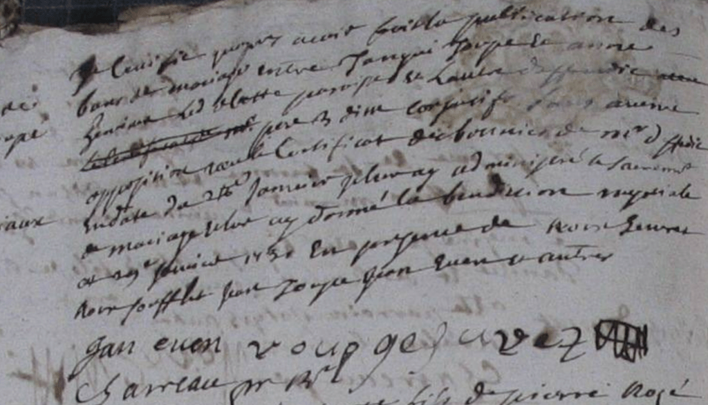 Je certifie quiconque, avoir fait la publication des bans de mariage entre Tangui TOUPE et Anne HERVIAUX, ledit de cette paroisse et l’autre d’Iffendic, sans aucune opposition veu le certificat de BOUNIER vicaire d’Iffendic en date du 26 janvier, je leur ay administré le sacrement de mariage et leur ay donné la bénédiction nuptiale le 29 janvier 1731 en présence de Roux GEURET, Roux SOUFFLET, Jean TOUPE, Jean EVEN et autres.