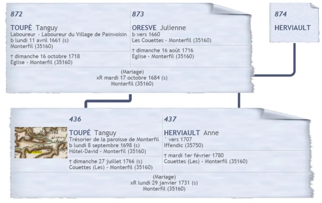 Je vous présente donc les parents de Tanguy TOUPÉ, à savoir, Tanguy TOUPÉ père et Julienne ORESVE, mariés le 17 octobre 1684 à Monterfil, et inhumés, tous les deux, dans l’église de cette paroisse.