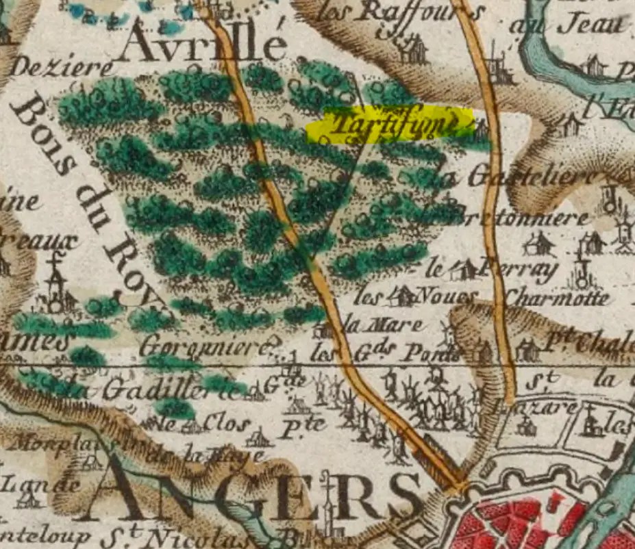 Locus qui dicitur Tart-y-fume 1331 (H.-D. B 45), sur l’ancienne route d’Angers au pont d’Epinard. C’est le domaine patrimonial dont prenait le nom notre bon chroniqueur Bruneau de Tartifume (Voir ici). Il l’aliéna en 1608, après la mort de sa mère, à messire Pierre BUSSON, avocat au Présidial (E 233, f. 36). En est sieur René de Roye, gentilhomme de la grande fauconnerie, en 1728.