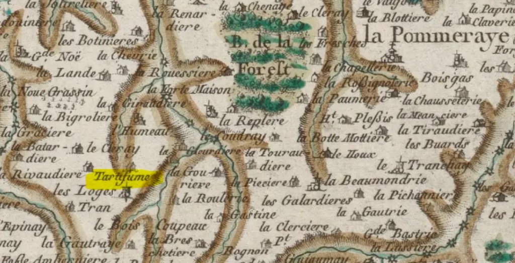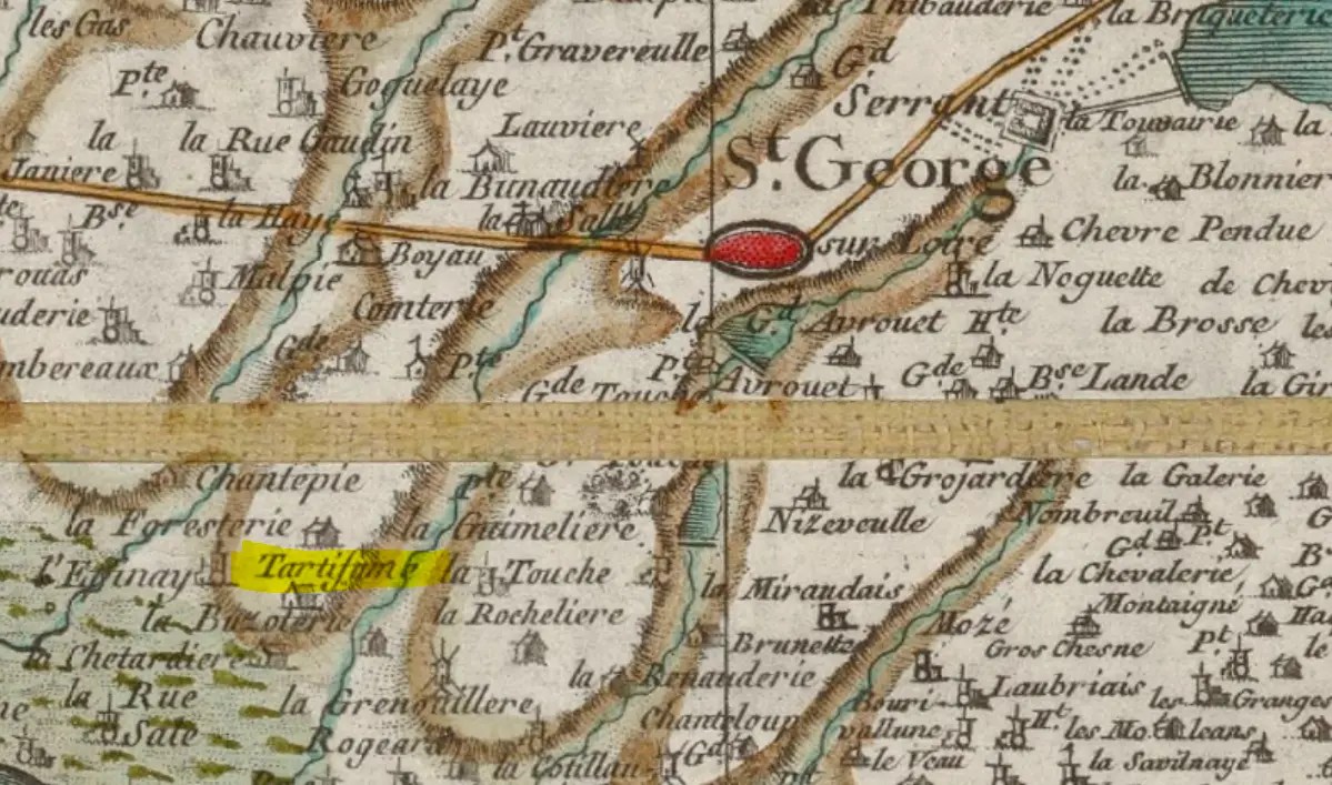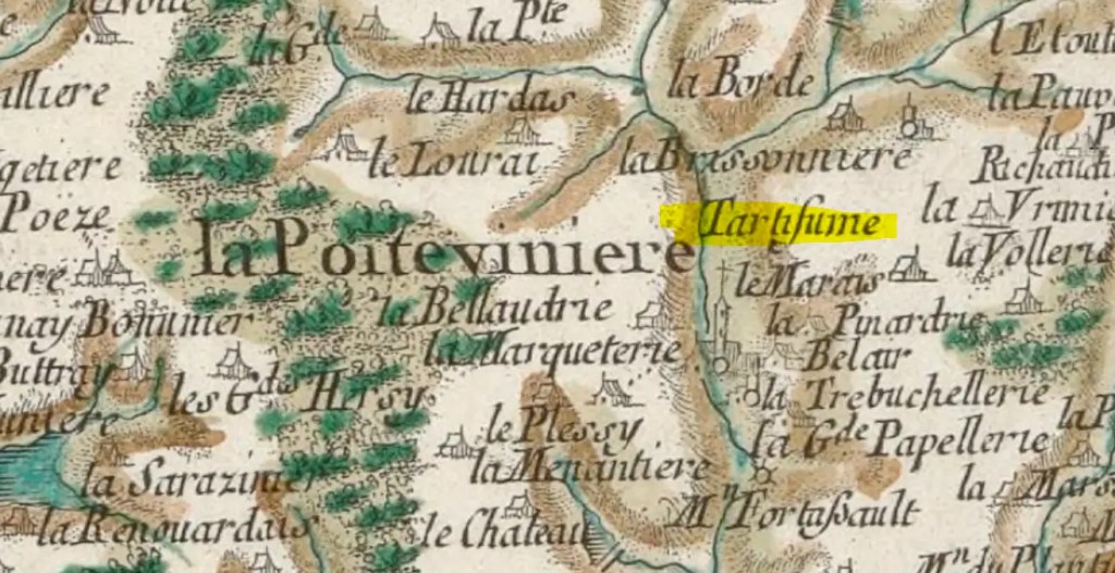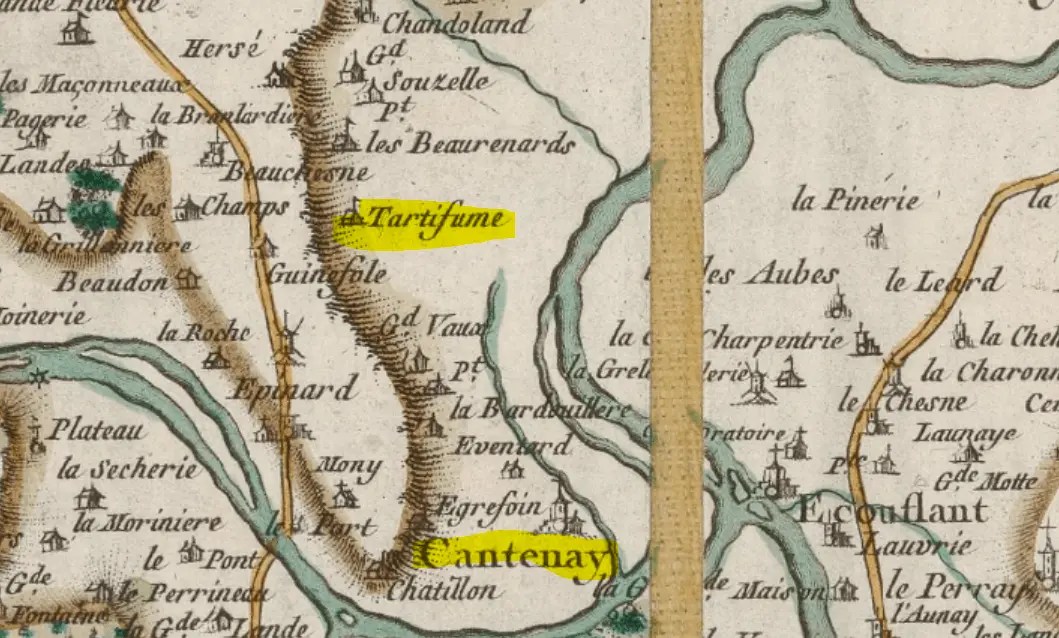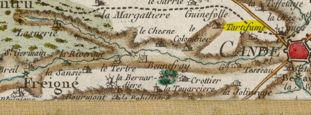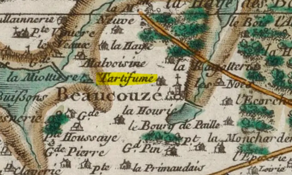 Il existe un lieu-dit, assez fréquent en Anjou, notamment dans le Maine-et-Loire, mais pas seulement; dont j’aime beaucoup le nom, c’est Tartifume. Comme nous avons la chance, toujours dans le Maine-et-Loire, de posséder le dictionnaire de Célestin Port, accessible en ligne sur le site des AD49, dans lequel un grand nombre de lieux-dits sont répertoriés, je me suis mise à la recherche de tous les Tartifume cités par l’archiviste sur ma carte préférée, accessible celle-ci sur Gallica, j’ai nommé bien-sûr la carte de Cassini.