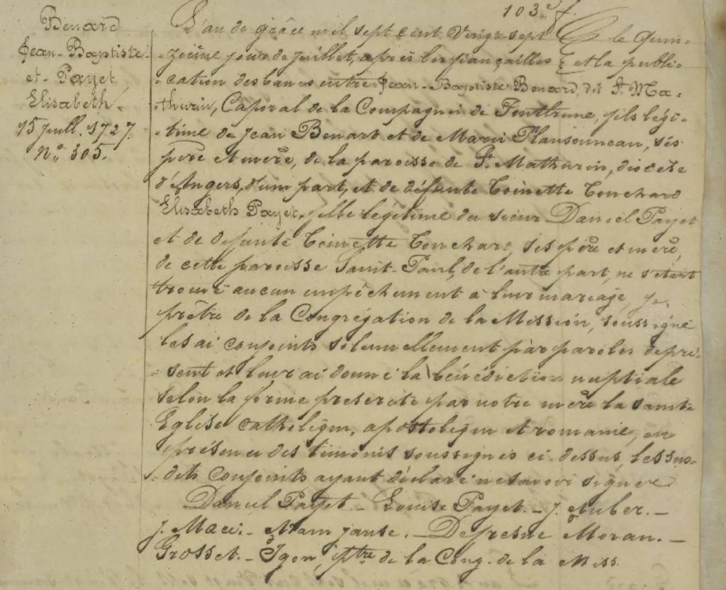 … Jean-Baptiste BENARD dit Saint Mathurin, Caporal de la Compagnie de Fontbrune, fils légitime de Jean BENART et de Marie PLANSONNEAU, ses père et mère, de la paroisse de Saint-mathurin, diocèse d’Angers, d’une part, et Elisabeth PAYET, fille légitime du sieur Daniel PAYET et de défunte Toinette TOUCHARD ses père et mère, de cette paroisse Saint-Paul…