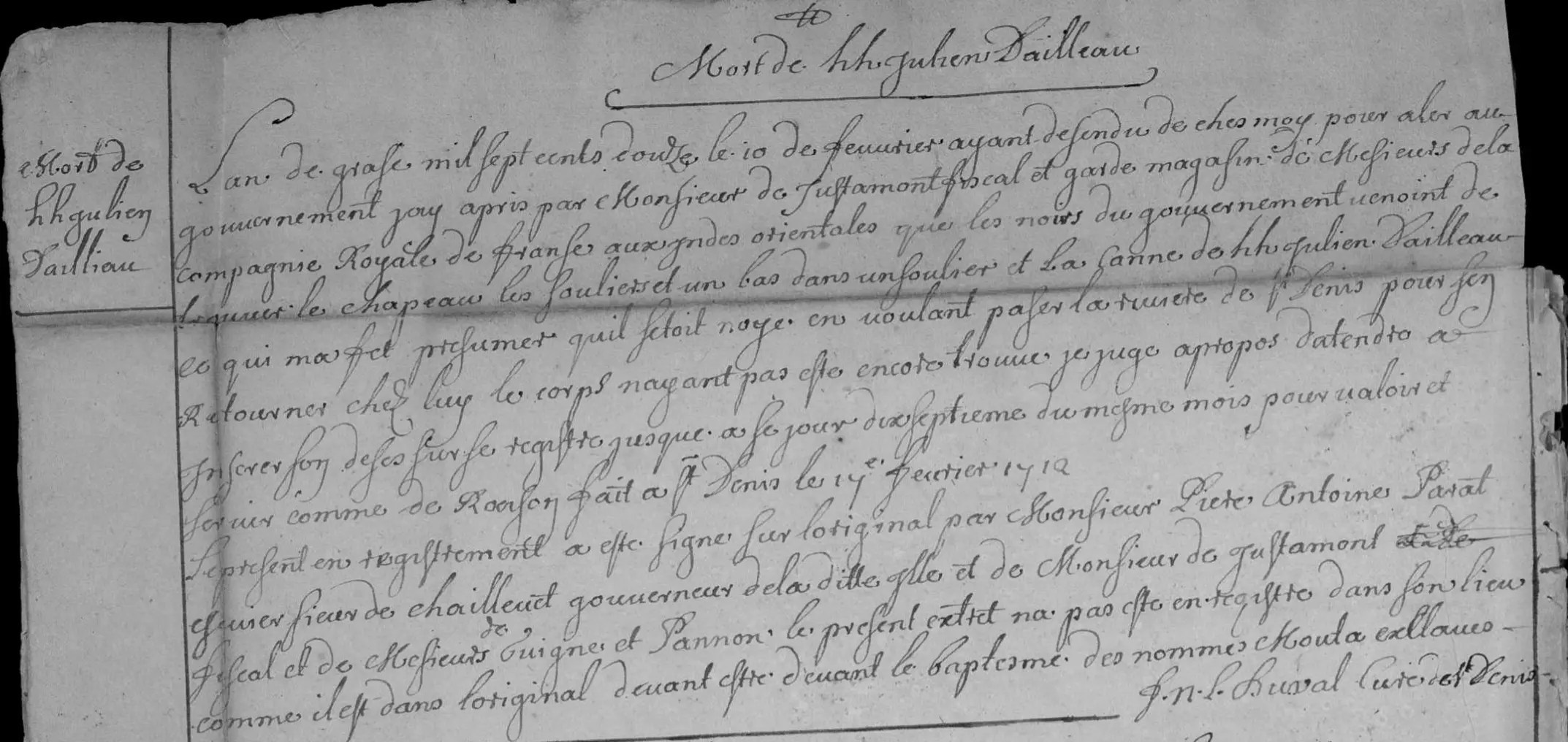 L’an de grase mil sept cents douze le 10 de feuvrier ayant desendu de ches moy pour aler au gouvernement, j’ay apris par Monsieur de Justamont fiscal et garde magasin de Mesieurs de la compagnie Royale de Franse aux Indes orientales que les noirs du gouvernement venoient de trouver le chapeau, les souliers et un bas dans un soulier et la canne de hh Julien DAILLEAU, ce qui m’a fet présumer qu’il s’etoit noyé en voulant paser la riviere de St Denis pour s’en retourner chez luy. […]