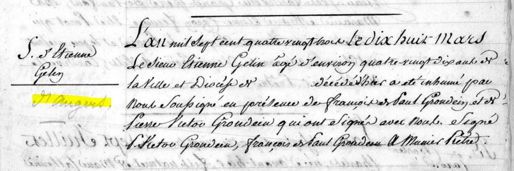 Etienne GESLIN se marie le 17 septembre 1726 à Marguerite DAILLAU. Il est inhumé le 18 mars 1783 à Sainte-Suzanne, âgé de quatre-vingt-dix ans, ou environ. Quelqu’un a ajouté au crayon, dans la marge, la mention « Angers« .