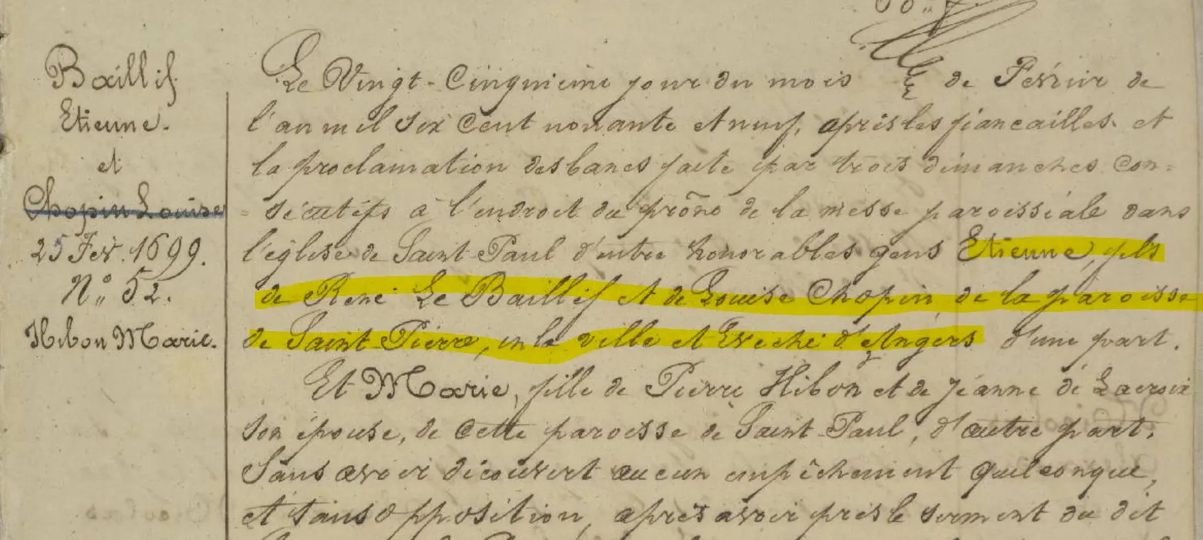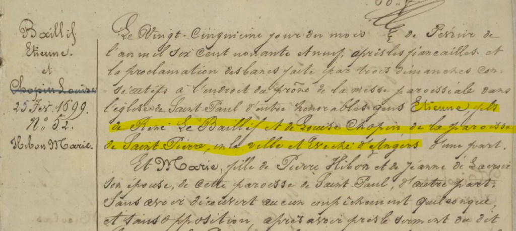 Il épouse Marie HIBON le 25 février 1699 et se dit natif de la paroisse Saint-Pierre d’Angers, fils de René BAILLIF et de Louise CHOPIN. Bien que l’on possède les noms de ses parents, son acte de baptême – du moins à ma connaissance – n’a pas été retrouvé.