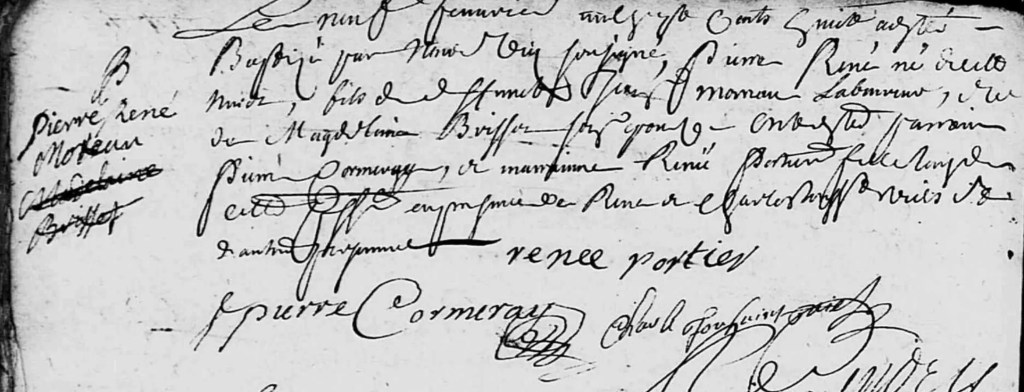Selon le Dictionnaire du peuplement, Pierre René MOREAU était originaire d’Angers. Il serait né vers 1703. Il s’est marié le 25 janvier 1729 à Sainte-Suzanne avec Françoise FONTAINE.
