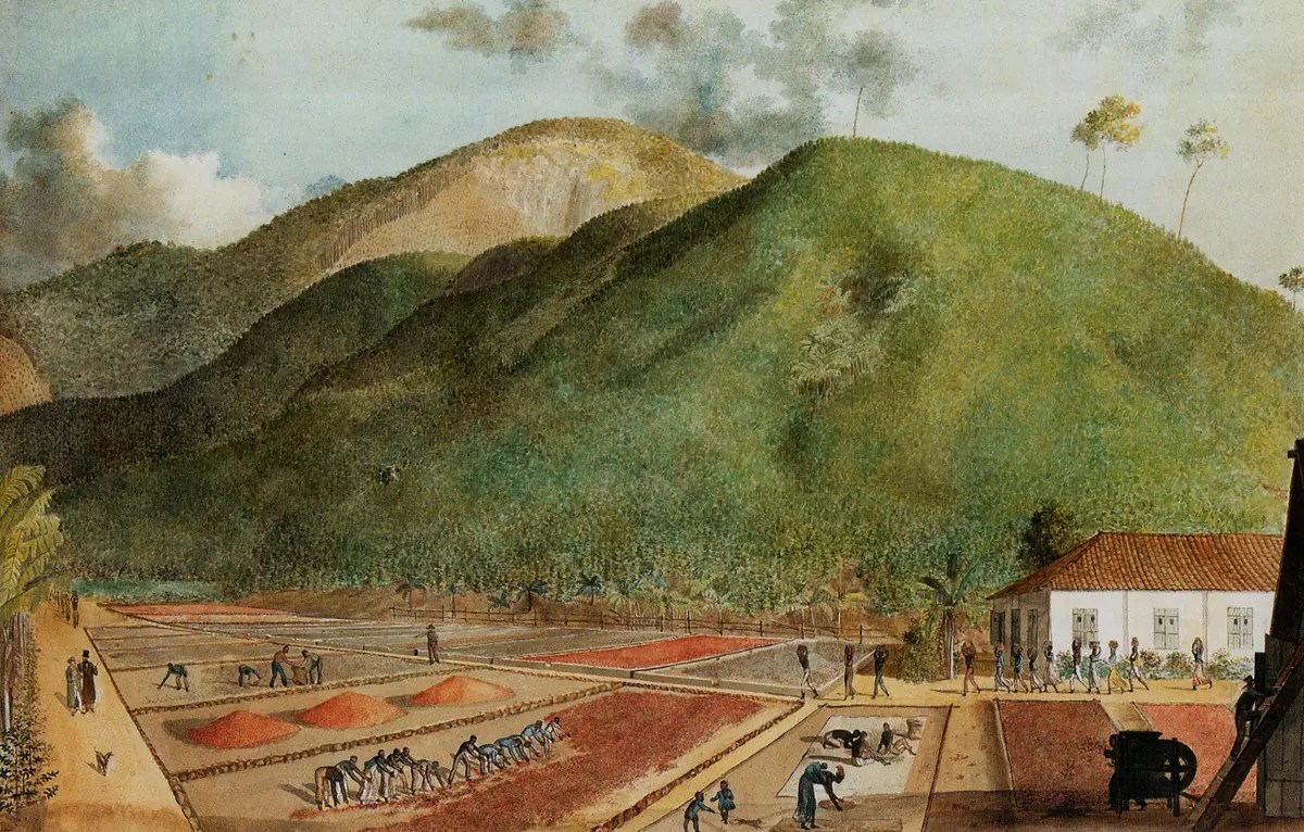 Vignette – La culture du café à l’île de Bourbon , aquarelle, début du XIXe siècle, attribuée à JJ Patu de Rosemont. (Wikipedia)
