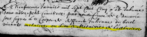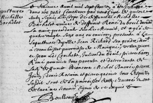 Le sixieme avril mil sept cent un a été inhumée dans nostre petit cemetiere par nous curé de Querré soubz signé le corps de deffuncte Michelle BACHELOT veuve de deffunct René DUBREIL décédée la nuit précédante sur le Minuict, et agée de quatre vingt seze ans ou environ, presantz à la sépulture d’iscelle Jean RICHARD son gendre demeurant à Veauboisset paroisse de Marigné, Urban, Pierre et Jean les CROCHETs, Julien DU BREIL, Pierre BARON, René POMMIER, tous parentz et descendants de ladite deffuncte et encore Michel BARRÉ, Pierre JOUIN, Denis ROSAIN et Pierre GASNIER, tous lesquels susdit sont de la paroisse dudit Querré et ont déclaré ne sçavoir signer de ce enquis.