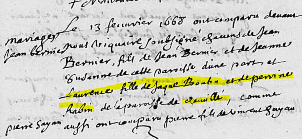 L’acte le plus ancien sur lequel apparaît Perrine RABIN est l’acte de mariage de sa fille, Laurence BOUTIN, mariée à La Tourlandry le 13 février 1668 avec Jean BERNIER. La Tourlandry se situe à une dizaine de kilomètres encviron au sud de Chemillé sur la route en direction de Coron.