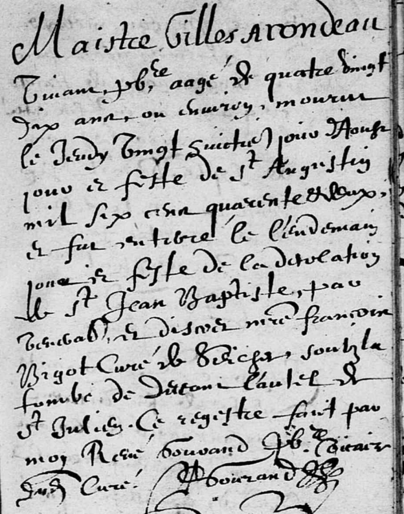 Maistre Gilles ARONDEAU vivant prestre, aagé de quatre vingt dix ans ou environ, mourut le jeudy vingt huictieme jour d’Aoust jour et feste de St Augustin mil six cent quarente et deux, et fut enterré le lendemain jour et feste de la décolation de St Jean Baptiste par vénérable discret Messire François BIGOT curé de Seiches, soubz la tombe de devant l’autel de St Julien.