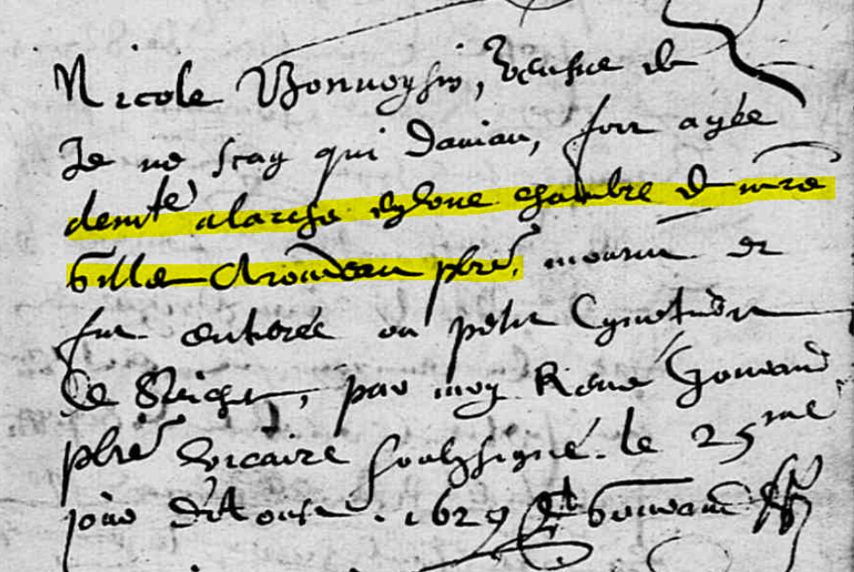 Nicole BONVOISIN veuve de « Je ne scay qui » DAVIAU, fort âgée demeurante à L’Arche en une chambre de Messire Gilles ARONDEAU prêtre, mourut et fut enterrée au petit cimetière de Seiches, par moy René GOURAND prêtre vicaire soussigné, le 25e jour d’aout 1629.