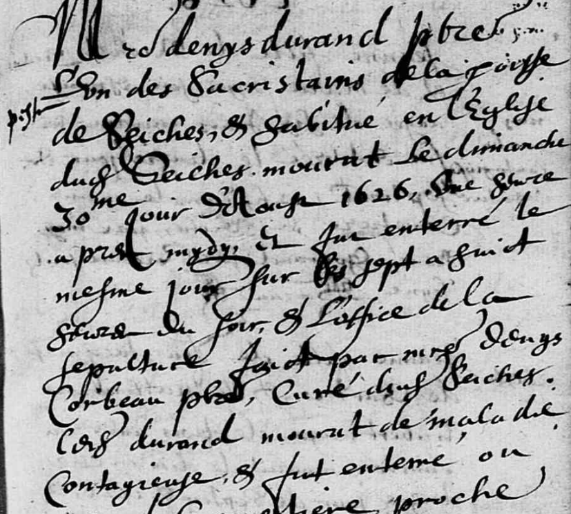 Messire Denis DURAND prêtre, l’un des sacristains de la paroisse de Seiches et habitué en l’église dudit Seiches, mourut le dimanche 30e jour d’aout 1626 une heure après midi et fut enterré le même jour sur les sept à huit heures du soir et l’office de la sépulture fait par Messire Denis CORBEAU prêtre curé dudit Seiches, ledit DURAND mourut de maladie contagieuse et fut enterré au grand cimetière