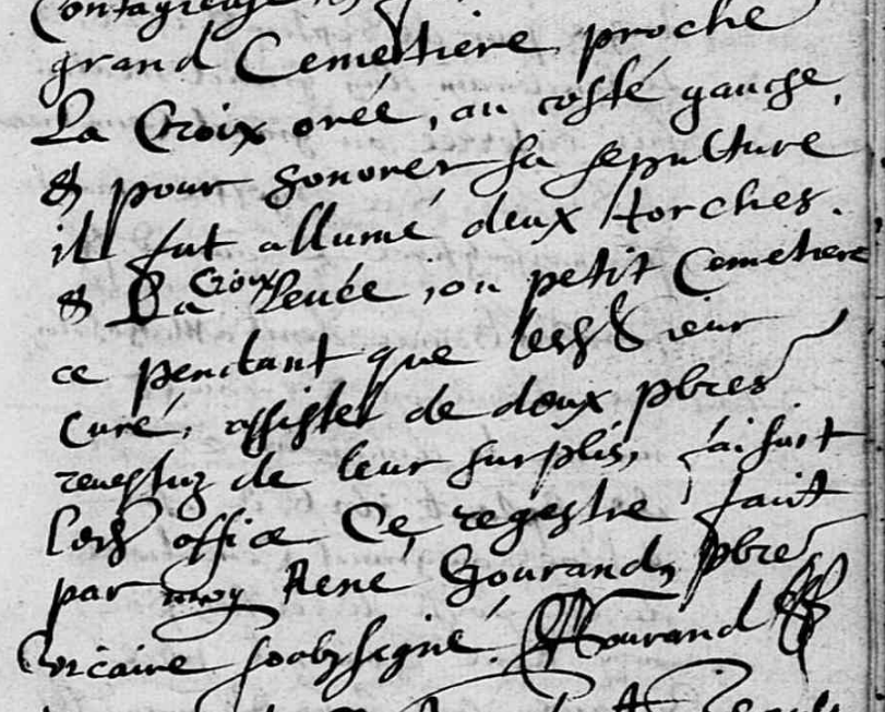 et fut enterré au grand cimetière proche la Croix orée, au côté gauche, et pour honorer la sépulture il fut allumé deux torches et la Croix levée au petit cimetière ce pendant que ledit sieur curé assisté de deux prêtres revêtus de leur surplis faisait ledit office. Ce registre fait par moi René GOURAND prêtre vicaire soussigné. »
