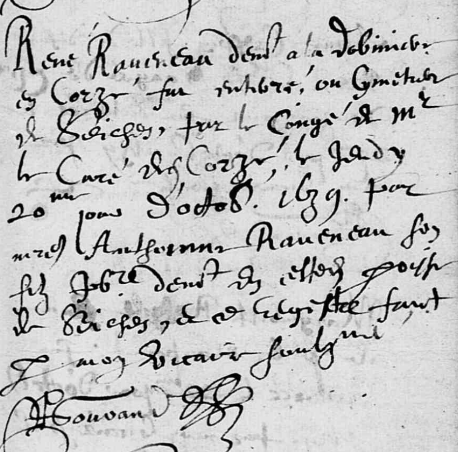 Antoine RAVENAU est originaire de Corzé. En 1639, alors qu’il est déjà prêtre à Seiches, il obtient la permission du curé de Corzé d’enterrer son père qui est mort à La Dobinière.