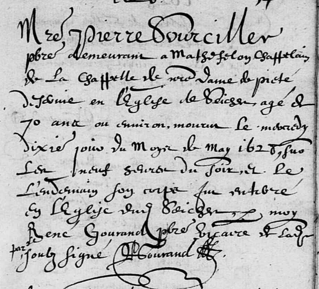 Messire Pierre SOURCILLER prestre demeurant à Mathefelon chappelain de la Chapelle de Nostre Dame de Piété desservie en l’Eglise de Seiches, agé de 70 ans ou environ, mourut le mercredy dixième jour du moys de may 1628, sur les neuf heures du soir et le lendemain son corps fut enterré en l’Eglise dudit Seiches par moy René GOURAND prestre vicaire de ladite paroisse soubz signé.