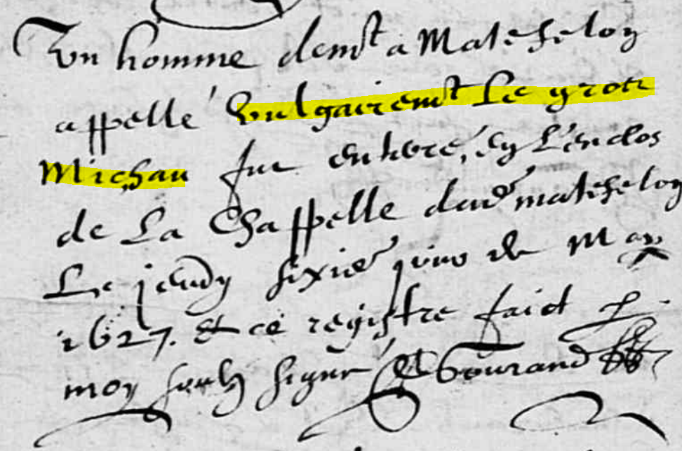 Un homme demeurant à Matefelon appelé vulgairement le Gros Michau fut enterré en l’enclos de La Chapelle dudit Matefelon le jeudi sixième jour de mai 1627.
