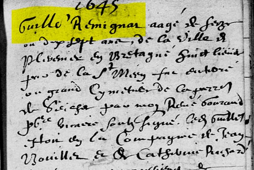 Guillaume REMIGNAC âgé de seize ou dix-sept ans de la ville de Plevenier en Bretagne, huit lieues par de la Saint Méen fut enterré au grand cimetière de la paroisse de Seiches par moi René GOURAND prêtre vicaire soussigné, ledit Guillaume était en la compagnie de Jean BOUILLET et de Catherine RICHARD sa femme, paroissiens de Marigné à trois lieues d’Orléans, pèlerins de Saint Méen, lequel BOUILLET nous a dit que ledit REMIGNAC les avait suivi pour faire le voyage de Saint Florent et le serment pris d’icelui BOUILLET s’il avait reconnu ledit REMIGNAC pour catholique et s’il avait vu entendre la Sainte Messe et faire autres actions de fidèle catholique. Il nous a affirmé que oui et de fait le dit défunt avait un chapelet sur lui, c’est pourquoi l’on a donné la sépulture chrétienne à son corps, le 11e jour de mars 1645.