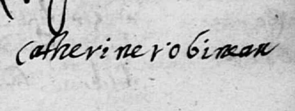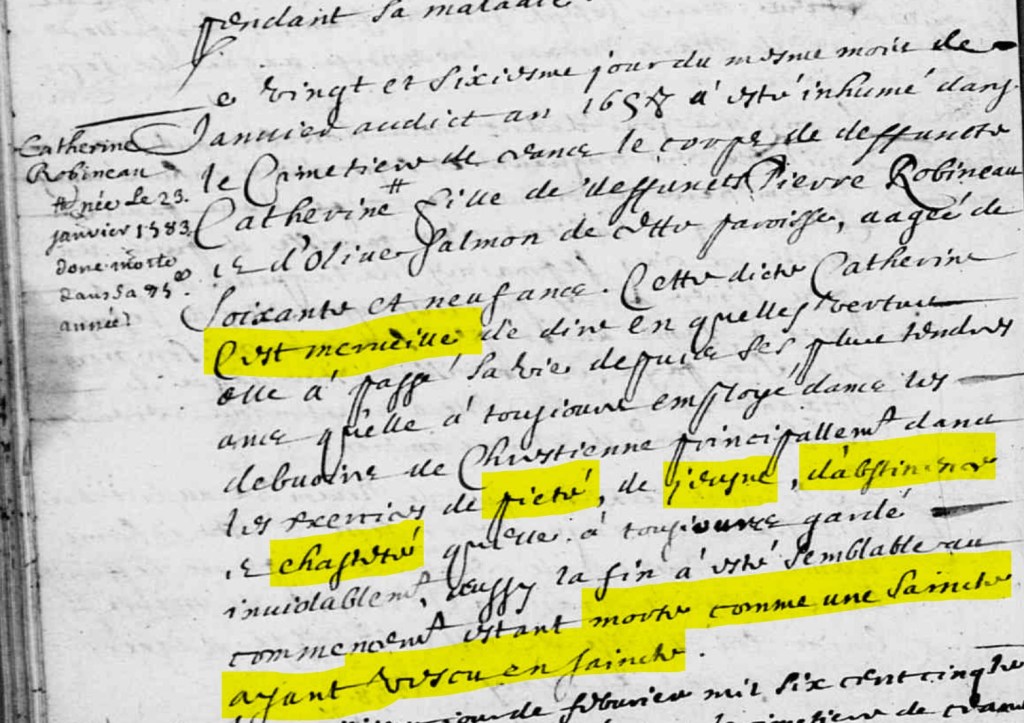 Le vingt et sixiesme jour du mesme mois de janvier audict an 1658 a esté inhumé dans le cimetiere de ceans le corps de deffuncte Catherine, fille de deffuncts Pierre ROBINEAU et d’Olive SALMON de cette paroisse, aagée de soixante et neuf ans. Cette dicte Catherine c’est merveille de dire en quelles vertus elle a passé sa vie depuis ses plus tendres ans, qu’elle a toujours employé dans les debvoirs de chrestienne, principallement dans les ecercices de piété, de jeusne, d’abstinence et chasteté, qu’elle a toujours gardé inviolablement, aussy sa fin a esté semblabe au commencement estant morte comme une saincte ayant vescu en saincte.