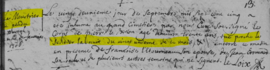 Le vingt deuxieme jour de septembre mil sept cent cin a eté inhumé au grand cimetière par nous curé soussigné le corps de Pierre LE BRETON agé d’environ trente ans, tué proche le sentier la nuit du vingt unième de ce mois, et enterré ce matin en présence de Françoise LETOURNEAU son épouse, de Jean EROMARD son oncle et de plusieurs autres témoins qui ne signent.