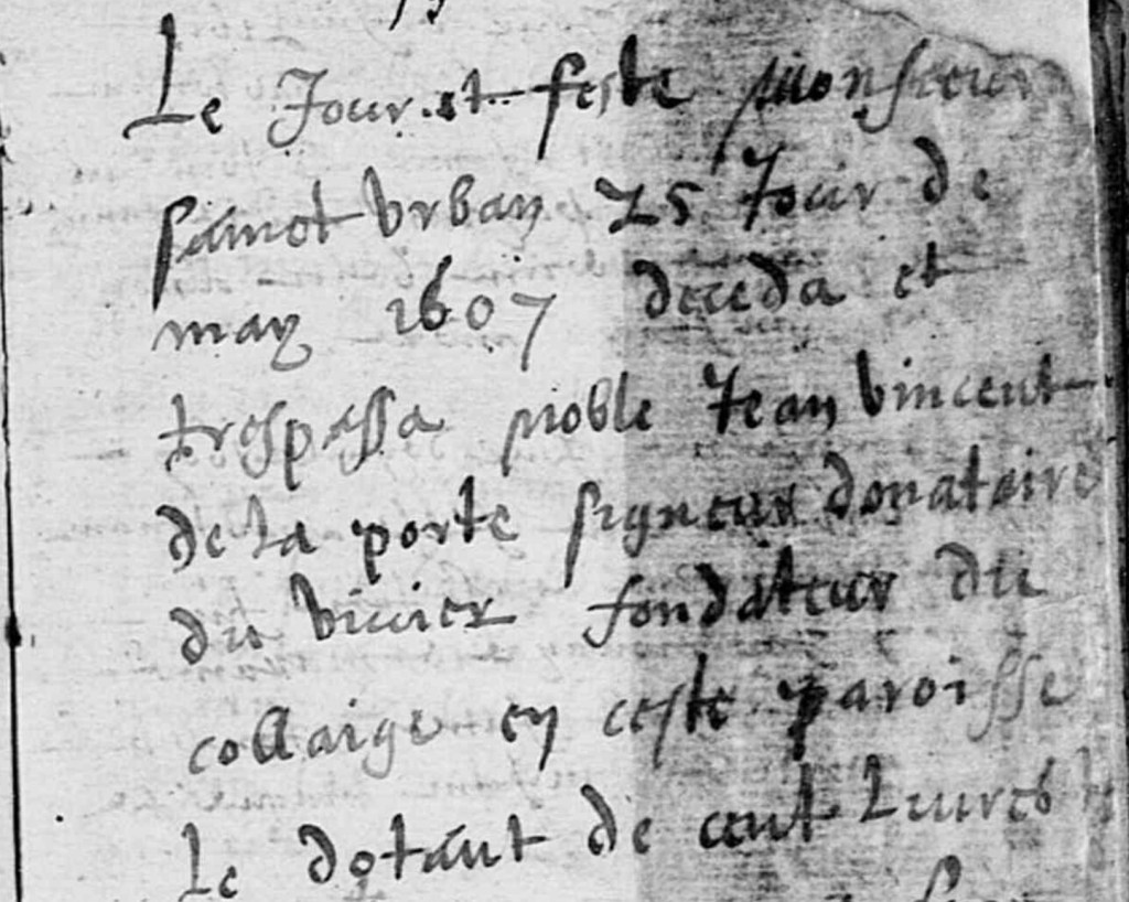 Le jour et feste Monsieur sainct Urban 25 jour de may 1607 deceda et trespassa noble Jean Vincent de la PORTE seigneur donataire du Vivier, fondateur du collaige en ceste paroisse le dotant de cent livres de rente, que ledit sieur avoit sur la maison de ville Paris comme appert par le contrat de donation dudit college passé par Thiellin notaire roial, ledit contrat insinué et enregistré aux greffes de Baugé et au Chastelet de ladite ville de Paris suivant l’ordonnence, tesmoing de quoy, moy soussigné curé de Lezigné et premier maistre dudit collège y nommé par ledit De La PORTE verifié ce que dessus estre veritable signé le jour et an que dessus. gloze de rente.