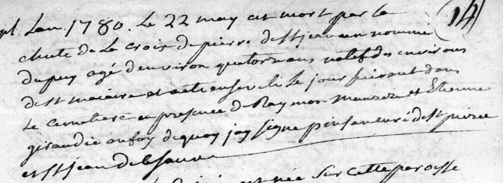 L’an 1780, le 22 may est mort par la chute de La croix de pierre de Saint Jean un nommé DUPUY agé d’environ quatorze ans, natif des environs de St Macaire et a eté enseveli le jour suivant dans le cimetière en présence de Raymon MAURERE et Etienne GIRAUDIE en foy de quoy j’ay signé PINSON curé de St Pierre et St Jean de La Sauve.