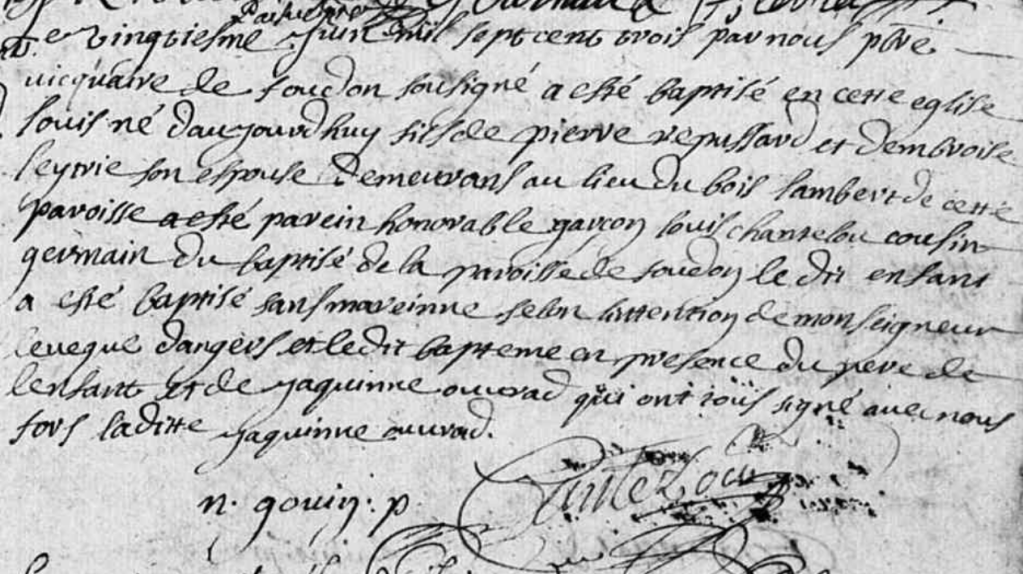 Le vingtiesme juin mil sept cent trois par nous prestre vicquaire de Foudon sousigné a esté baptisé en cette église Louis né d’aujourd’huy fils de Pierre REPUSSARD et d’Embroise LEYTRIE son espouse, demeurant au lieu du Bois Lambert de cette paroisse a esté parein honorable garçon Louis CHANTELOU cousin germain du baptisé de la paroisse de Foudon, ledit enfant a esté baptisé sans mareinne selon l’attention de monseigneur l’eveque d’Angers et ledit bapteme en presence du pere de l’enfant et de Jaquinne OUVRARD qui ont tous signé avec nous fors laditte Jacquinne OUVRARD.