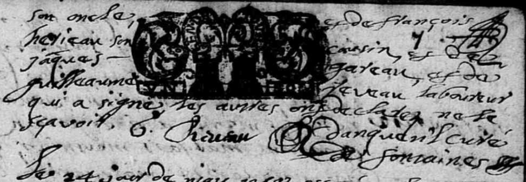 Le vingt et cinquiesme jour de septembre mil six cent soixante et dix ont espousés en l’église de Chartrené chacun de René fils de François THEUSLIER et Marguerite MAUCLER et Perrine fille de deffunct François REVEAU et Jacquine POIRIER es presence de François THEUSLIER père dudit espoux et de François et Mathurin les REVEAUX frères de ladite espouse et plusieurs autres, lesquels ont dict ne scavoir signer.