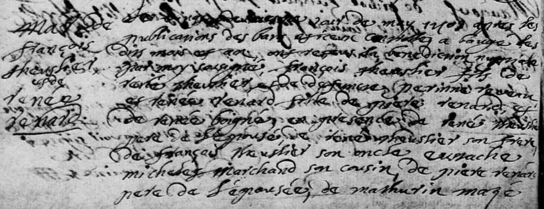 Le vingt deuxiesme jour de may 1703 apres les publications des bans et ceux controllés à Baugé les dits mois et an, ont receus la benediction nuptiale par moy soussigné François THEUSLIER fils de René THEUSLIER et de défuncte Perrine REVEAU, et Renée RENARD fille de Pierre RENARD et de Renée BOIGNÉ, en présence de René THEUSLIER père de l’épousé, de René THEUSLIER son frère, de François THEUSLIER son oncle, Eustache MICHELET marchand son cousin, de Pierre RENARD père de l’épousée, de Mathurin MAZÉ son oncle et de François HERICAU son cousin et de Jacques GAZEAU et de Guillaume REVEAU laboureur qui a signé, les autres ont déclarés ne le sçavoir.