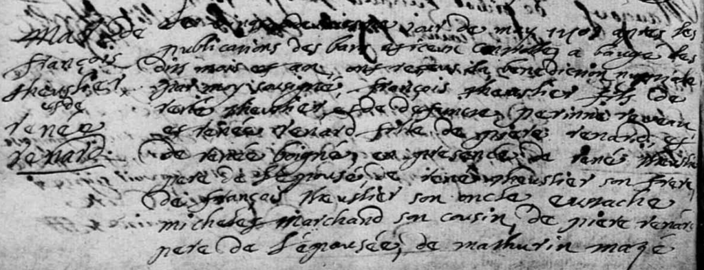 Ce mariage est très riche en informations. Grâce à le présence d’un cousin du marié, au nom peu fréquent, Eustache MICHELET, je découvre assez rapidement quelques ancêtres de plus du côté THEUSLIER. En effet, Eustache MICHELET est le mari de Louise MENARD, elle-même fille d’André MENARD et de Louise THEUSLIER. Or, ces derniers se sont épousés à Chartrené, le 6 septembre 1662. Les parents de Louise sont François THEUSLIER et Marguerite MAUCLER, et hop ! Deux nouveaux ancêtres dans mon arbre. Mais ce n’est pas tout !