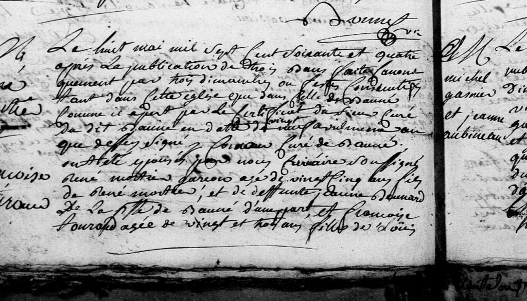 Le huit mai mil sept cent soixante et quatre après la publication de trois bans faite canoniquement par trois dimanches ou festes consécutifs tant dans cette église que dans celle de Bauné, comme il appert par le certificat du sieur curé du dit Bauné en datte du vingt neuf avril meme an que dessus signé J. Coineau curé de Bauné, ont été epousés par nous vicaire soussigné René MORTIER garçon âgé de vingt cinq ans, fils de René MORTIER et de déffunte Anne BOUMARD de la paroisse de Bauné d’une part, et Françoise TOURAUD agée de vingt et trois ans, fille de Louis TOURAUD et de Catherine GIRARD,ont été presents du coté de l’époux René MORTIER, Georges PIQUET, et du coté de l’épousée, Pierre TOURAUD et Guillaume TOURAUD, lesquels ont declaré ne savoir signer.