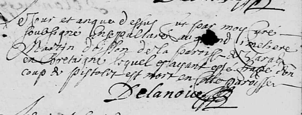 Le jour et an que dessus fut par moy curé soubsigné ensepulturé au grand cimetiere Martin DOISLON de la paroisse de Varade en Bretaigne, lequel ayant esté frapé d’un coup de pistolet est mort en cette paroisse.