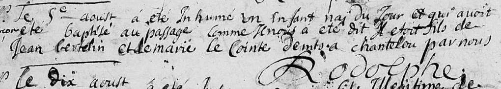 Drôle d’expression ! Cet enfant est inhumé le 5 août 1691 à Notre-Dame-d’Allençon. J’ai d’abord cru qu’il s’agissait d’un enfant de pèlerins, cependant ses parents, Jean BERTELIN et Marie LECOINTRE s’étaient mariés l’année précédente dans cette même paroisse de Notre-Dame-d’Allençon, le 29 août 1691. Ils y eurent plusieurs autres enfants et y demeurèrent vraisemblablement toute leur vie…