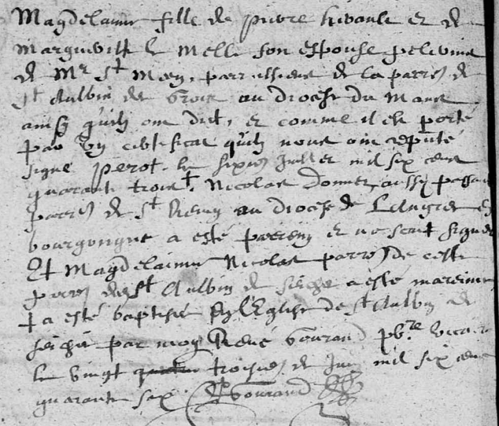 Magdelaine fille de Pierre HERAULT et de Margueritte LE MELLE son espouse pèlerins de Monsieur Saint Meen, paroissiens de la parroise de Saint Aubin de Groix au diocèse du Mans, ainsy qu’ilz ont dict, et comme il est porté par un certificat qu’ilz nous ont representé signé PEROT le sixième juillet mil six cent quarante trois, + a esté baptisé en l’Eglise de Saint Aubin de Seiches par moy René GOURAND prestre vicaire le vingt troisiesme de juin mil six cent quarante six, Nicolas DONNETZ aussy passant paroissien de Saint Rémy au diocèse de Langres en Bourgongne a esté parrein et ne sçait signer et Magdelainne NICOLAS parroissienne de ceste paroisse de Saint Aubin de Seiches a esté mareinne.