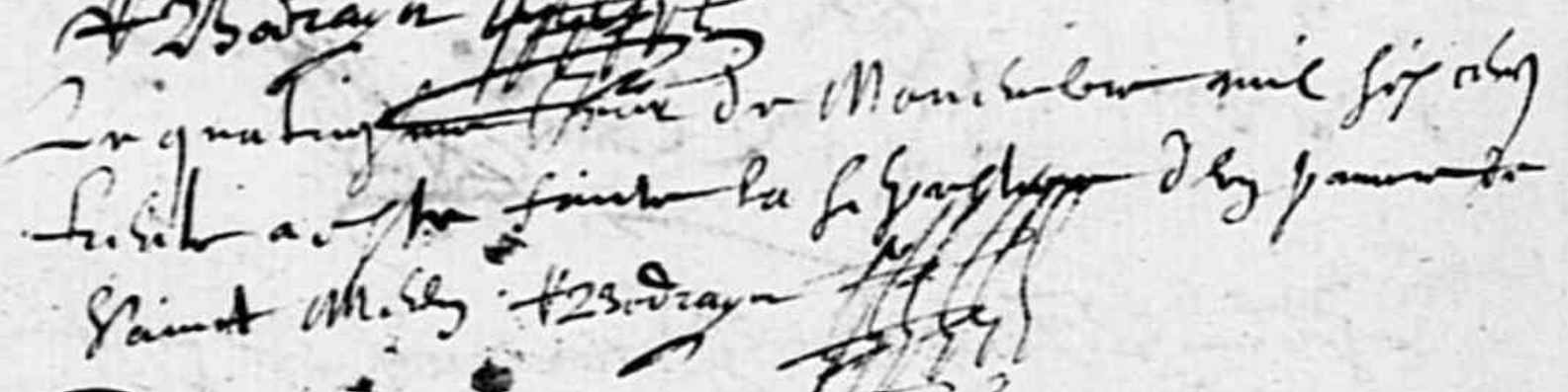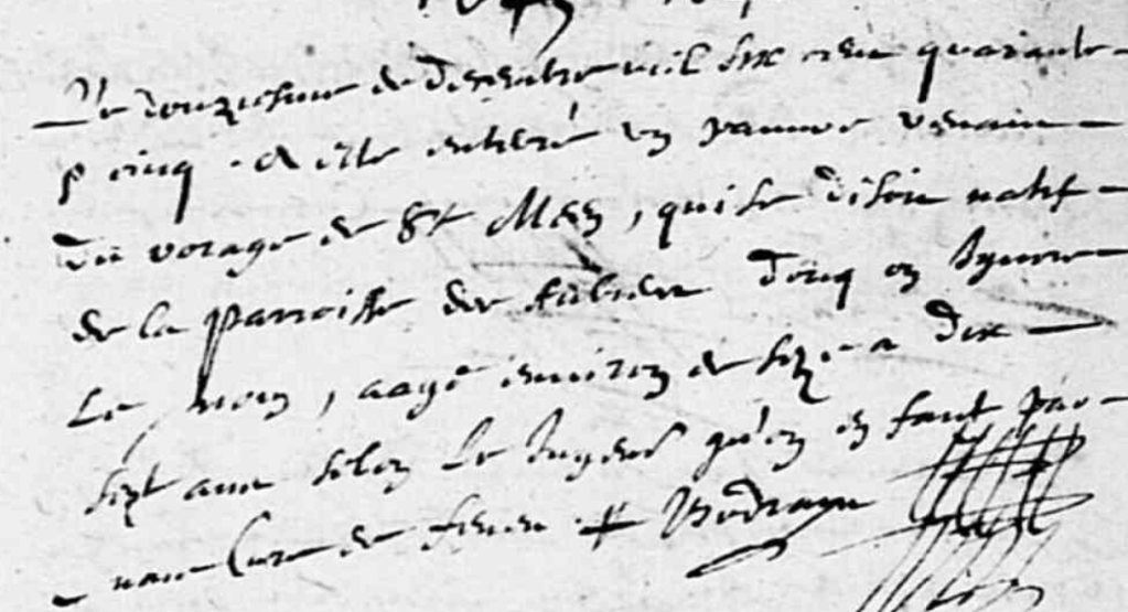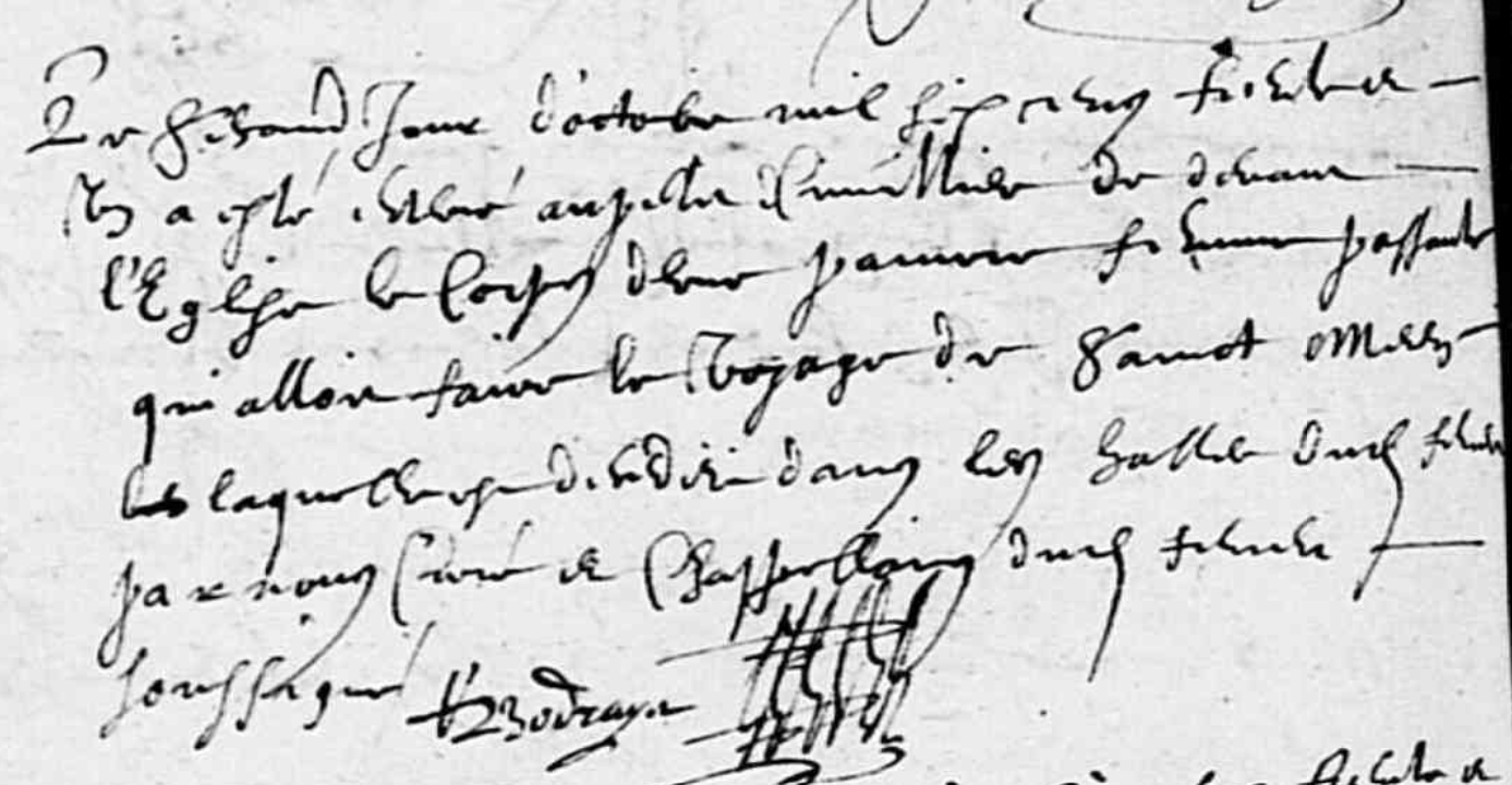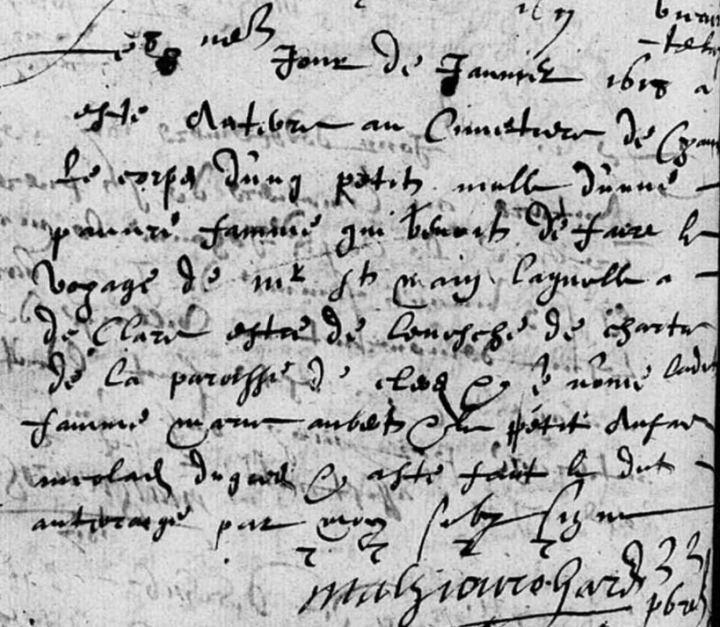 Le 8eme jour de janvier 1618 a esté anterré au cimetiere de ceans le corps d’ung petit malle d’une pauvre famme qui venoit de faire le voyage de Mr St Main, laquelle a declaré estre de l’Evesché de Chartres de la paroisse d’[?*] et est nommé ladite famme Marie AUBERT et le petit anfant Nicolas DUGART et a esté faict le dict anterraige par moy soubz signé.
