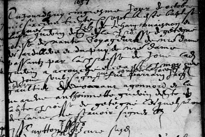 Aujourd’huy cinquiesme jour d’octobre mil six cent trente et sept a esté baptisé Jacques, filz de Jehan TOUAISNON et de Louise GUERIN demeurant en la paroisse de Gétigné, diocèse de Nantes, voyageurs de Notre Dame des Ardillères et du Puy Notre Dame, passantz par ladite paroisse ce jour. Ladite GUERIN a accouché et ce a esté par moy curé de Joué soubz signé qui a controlé (?] le baptesme, fut parain Jacques GAULTIER demourant à Gonord et la marenne Anthoinnette GUERIN demeurant en ladite Paroisse de Getigné, lesquelz ont declaré ne scavoir signer.