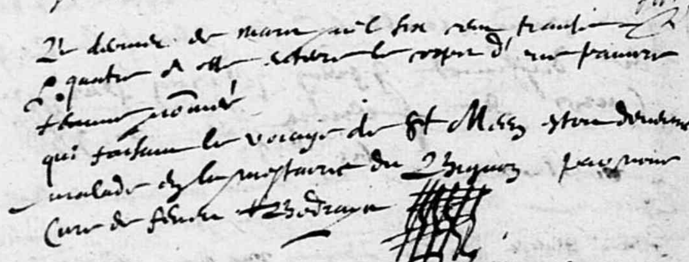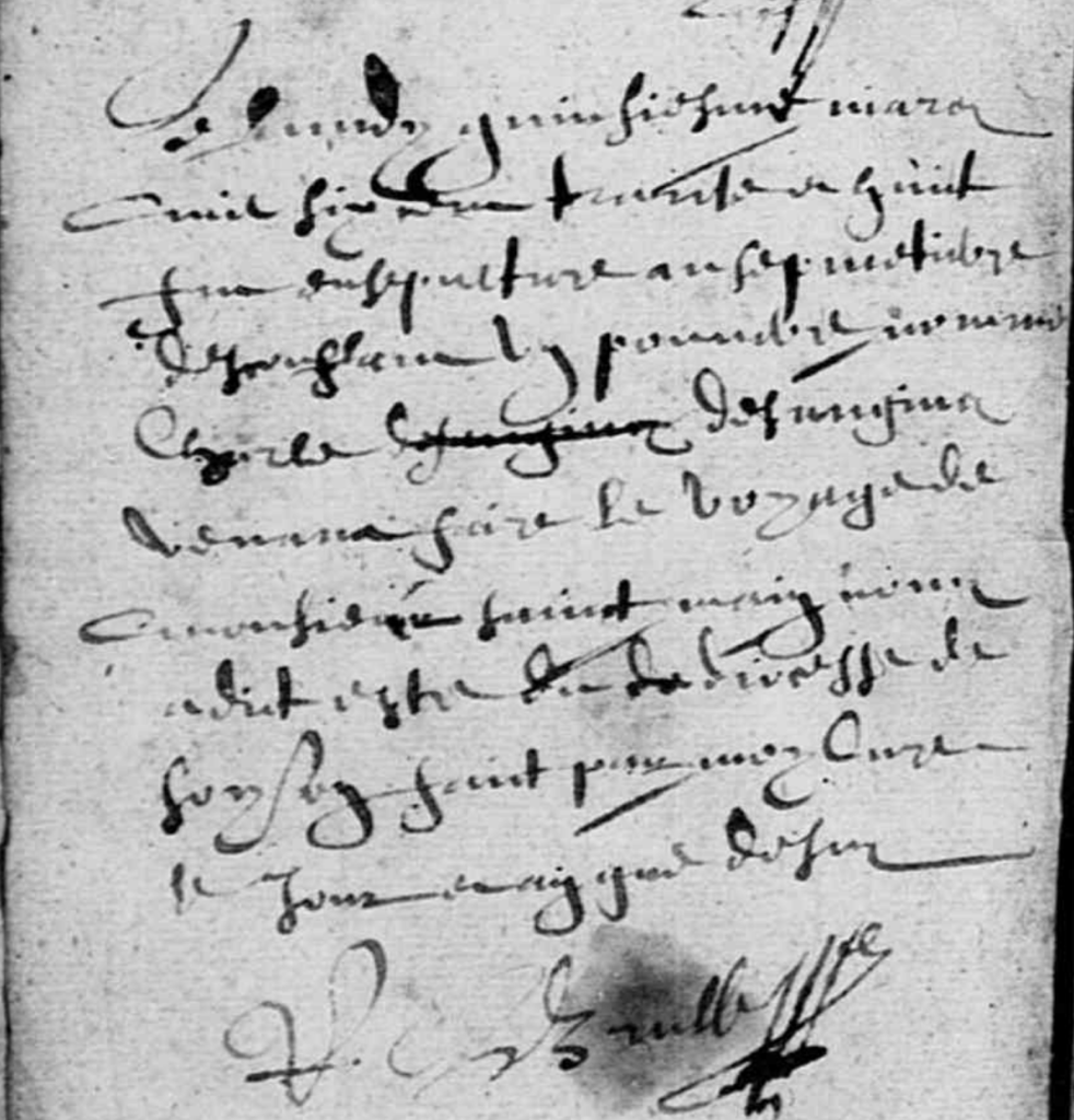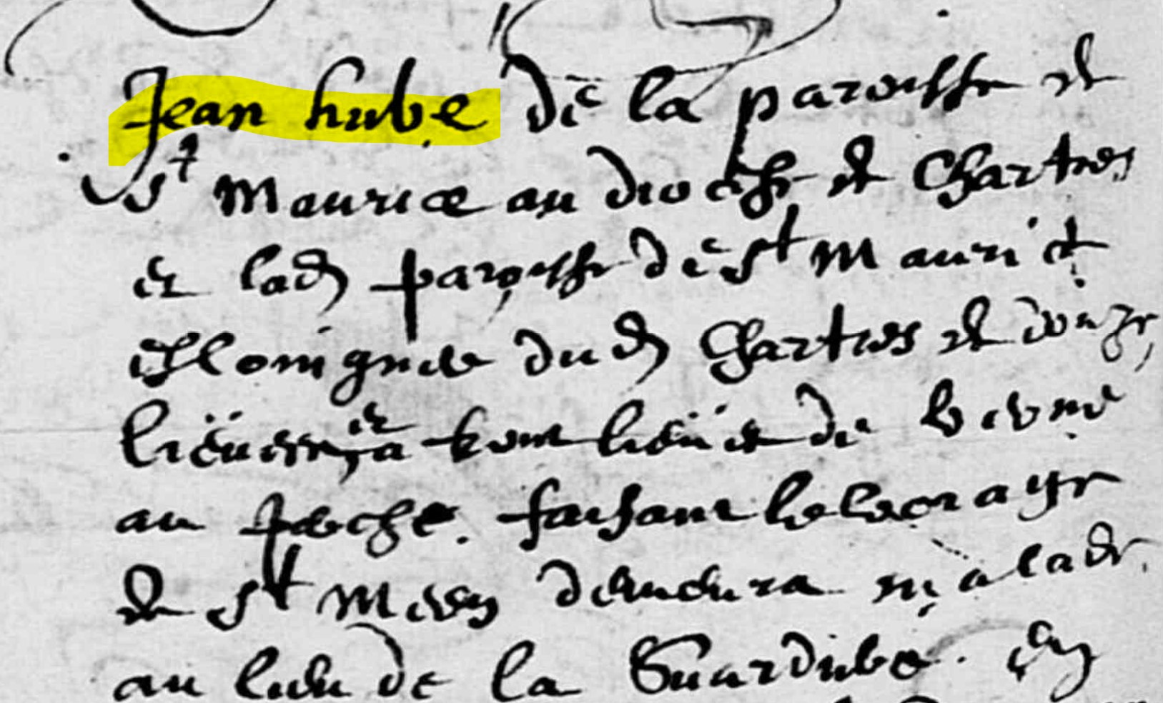 Jean HUBÉ de la paroisse Saint Maurice au diocèse de Chartres et ladite paroisse de Saint Maurice éloignée dudit Chartres de douze lieues et à trois lieues de Vienne au Perche faisant le voyage de Saint Méen demeura malade au lieu de La Suardière en Montreuil, environ dix ou douze jours durant lesquels ( ?) honorable fille Symphorienne De La PORTE dame dudit lieu de La Suardière et René RIFAUT closier audit lieu, ont vu ledit Jean HUBE réciter le Pater, l’Avé et dire Jesus Maria et demander la confession sacramentale. Ledit HUBÉ étant mort, son corps a été enterré dans le grand cimetière de la paroisse de Seiches par moi vicaire soussigné à l’instance et prière de Mathurine MACON se disant sa femme et âgée de vingt sept ans ou environ et encore de ladite DE LA PORTE, en présence dudit RIFAUT et de Jean VIELLE, le 25e jour de janvier 1644.