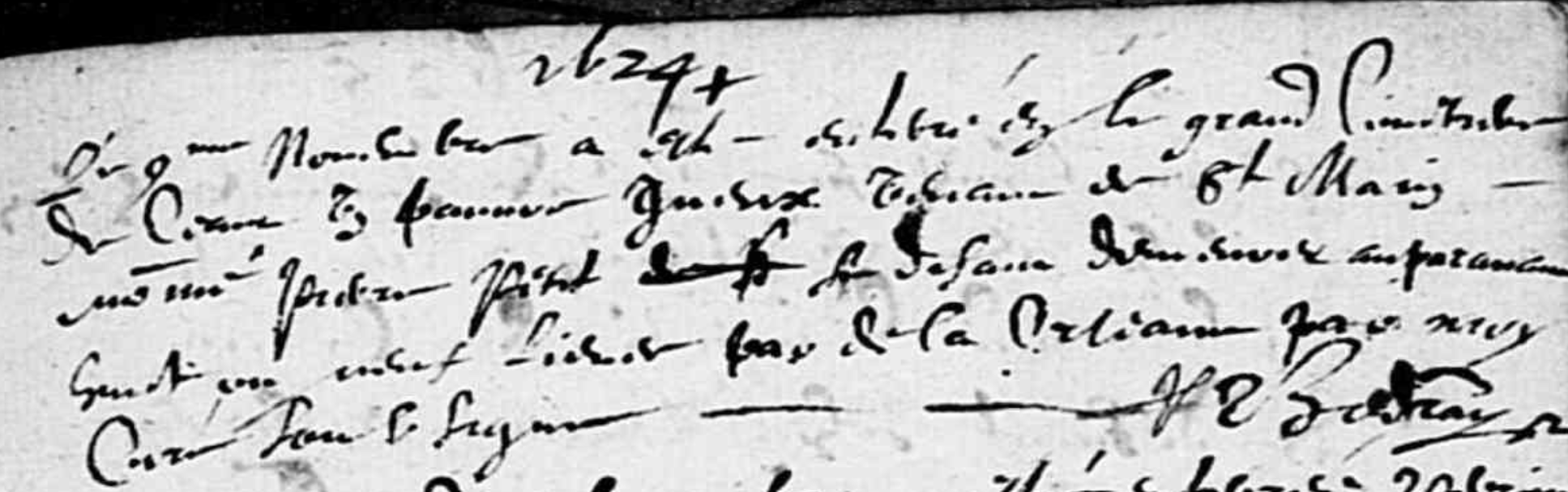 Le 9ème novembre a esté enterré en le grand cimetiere de ceans, un pauvre gueux venant de St Main, nommé Pierre PETIT, se disant demeurer auparavant, huit ou neuf lieues par de là Orléans, par moy curé soubssigné.