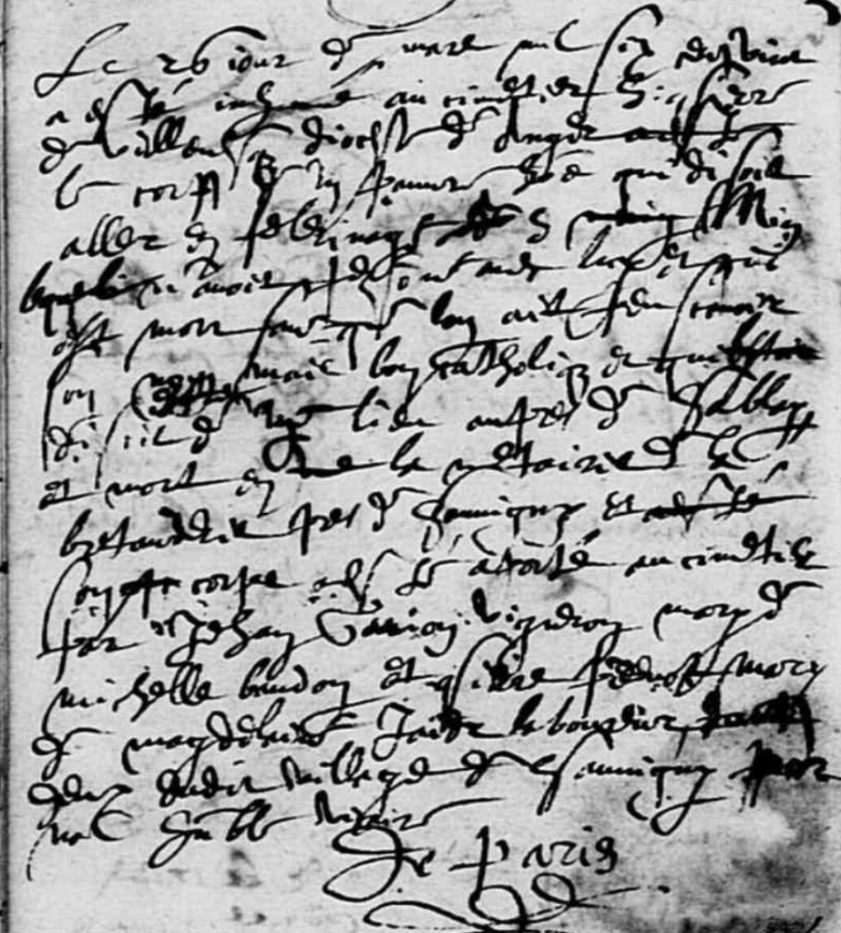 Le 26 jour de mars mil six cens vint a esté inhumé au cimetiere Saint Pierre de Villevesque, diocses d’Angers, le corps d’un pauvre homme qui disoit aller en pelerinage a Saint Min, lequel bien avoit ? ans et qu’il est mort sans que l’on ait peu scavoit son nom, mais bon catholique et qu’il estoit, dit il, d’un lieu aupray de Sablay. Il mort en la mestairie de la Bretaudière près de Souvigny et son corps a esté apporté au cimetiere par Jehan GOUION vigneron, mary de Michelle BAUDON et Pierre FREMONT mary de Magdelaine JAIER laboureur, tous deux dudit village de Souvigné par moy humble vicaire. De Paris.