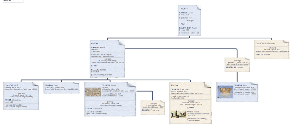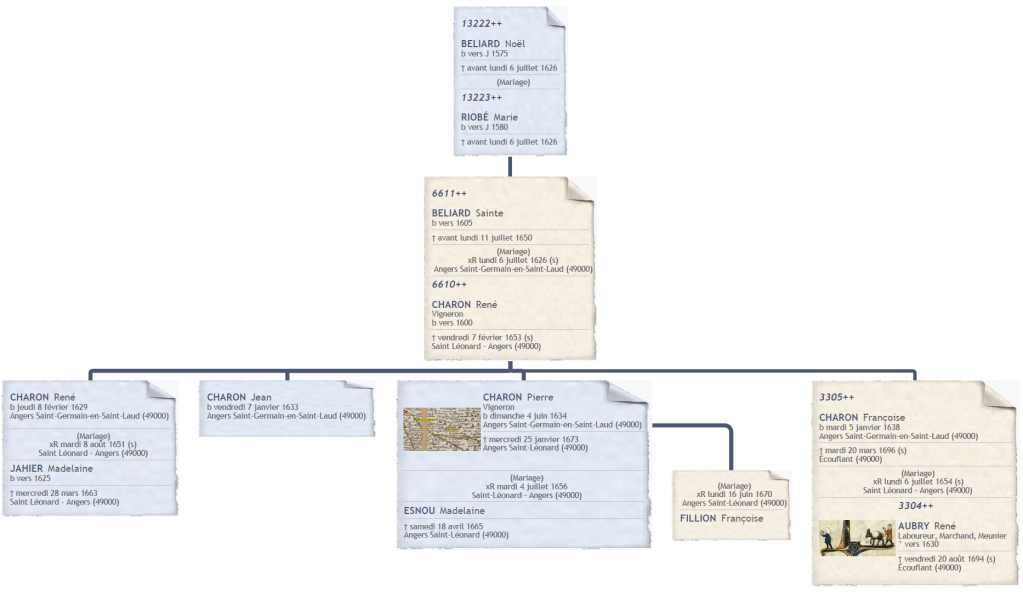 René CHARON le Jeune est assez facile à retrouver. Le 8 août 1651, il avait épousé à Saint-Léonard d’Angers, Marguerite JAHIER. Son acte de mariage est filiatif, il est le fils de René CHARON, encore vivant, et de Sainte BELIARD, décédée. A son mariage, sont présents également un Jean CHARON, qui se trouve être son grand-père, et ledit René CHARON, son père.