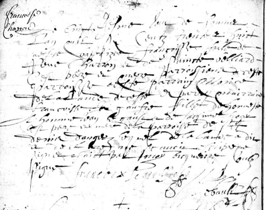 Le cinquiesme jour de janvier, l’an mil six centz trente huict a esté baptizée Françoisse fille de René CHARRON et de SAincte BELLIARD ces pere et mere, parroissiens de ceste parroisse, a esté parrain Morice DE LA LANDE de ceste parroisse, marraine Françoisse LE GAUFRE fille d’honneste homme Jean LE GAUFRE et de Jacquine FROGER ses pere et mere de la parroisse de St Denis d’Angers, lequel DE LA LANDE a dit et déclaré ne savoir escripre. Signé et faict par moy vicquaire soubz signé.