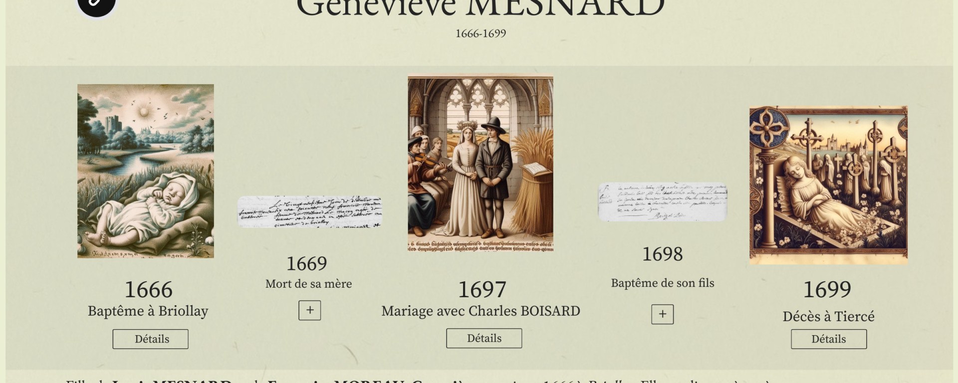 Geneviève MENARD naquit en 1666 à Briollay. Elle est issue du mariage de Louis MENARD avec Françoise MOREAU, sa seconde femme, avec laquelle il eut quatre enfants. Cette dernière ne survécut pas à la naissance de jumeaux en avril 1669 et mourut, laissant derrière elle la petite Geneviève, âgée d’à peine deux ans. Le père de Geneviève se remaria très rapidement et épousa Marguerite BROSSARD avec qui il eut encore plusieurs enfants et qui s’occupa de Geneviève et de tous les autres enfants nés de ses précédents mariages. Mais elle aussi mourut. C’est ainsi que Geneviève ne se maria que sur le tard. En 1697, âgée de 31 ans, elle épousait un homme veuf, Charles BOISARD. Hélas, son mariage ne dura pas même deux ans. Elle accoucha d’un garçon, en octobre 1698, Louis BOISARD, puis mourut, quelques mois plus tard, en février 1699, âgée de 32 ans.