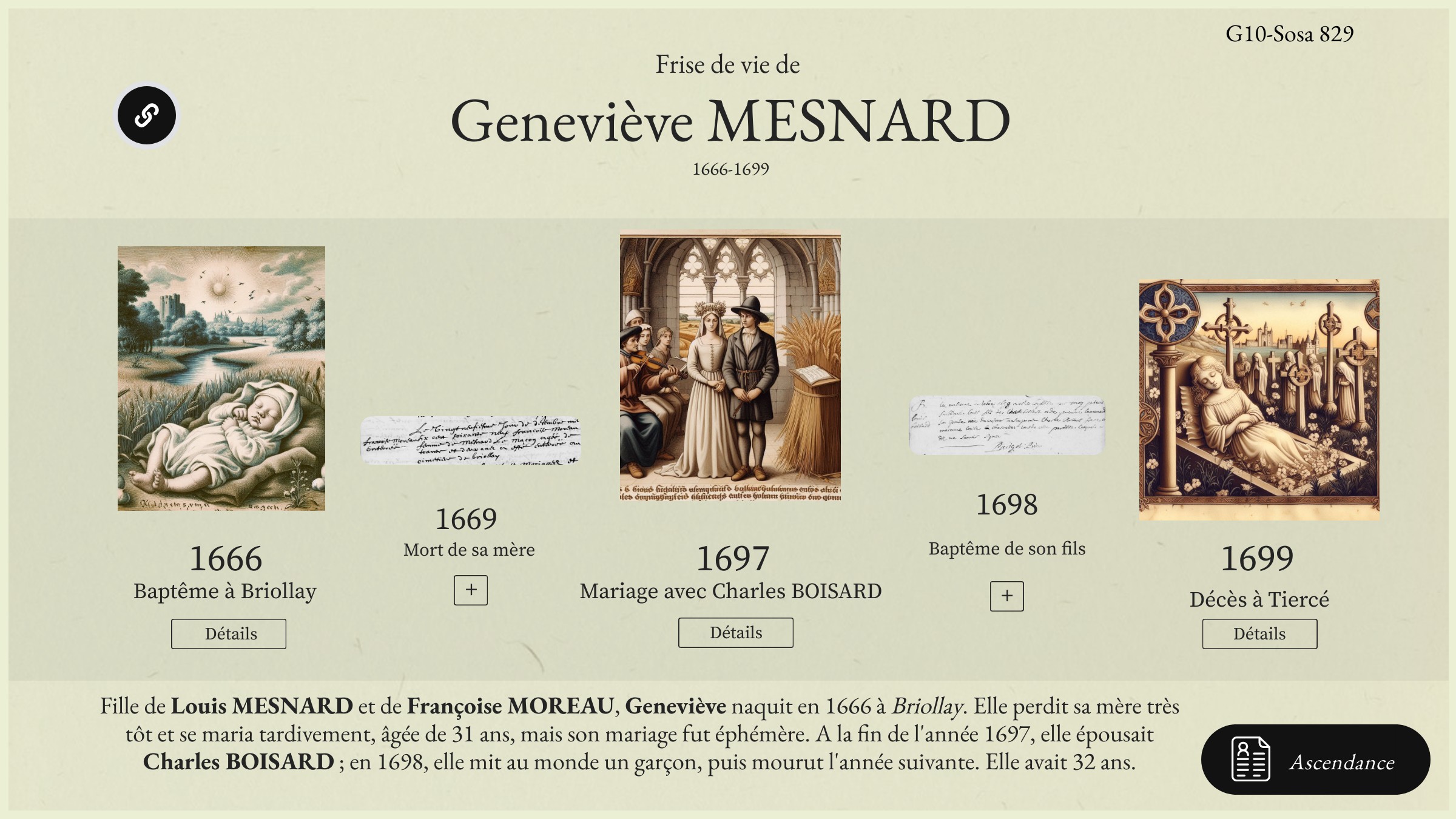 Geneviève MENARD (1666-1699) 100 mots pour une vie Geneviève MENARD naquit en 1666 à Briollay. Elle est issue du mariage de Louis MENARD avec Françoise MOREAU, sa seconde femme, avec laquelle il eut quatre enfants. Cette dernière ne survécut pas … Lire la suite M comme MENARD