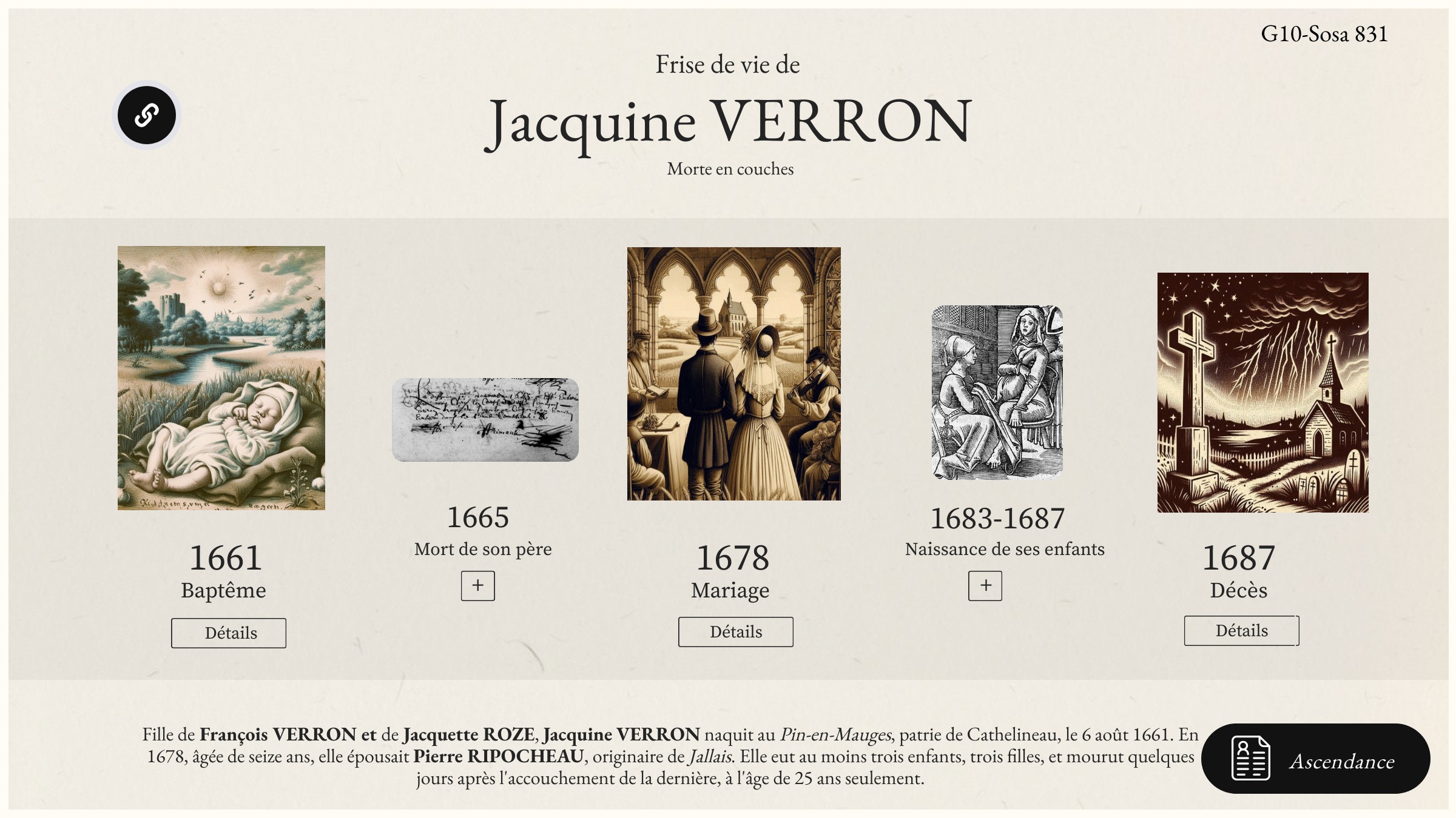 Jacquine VERRON (1661-1687) 100 mots pour une vie Fille de François VERRON et de Jacquine ROZE, Jacquine VERRON naquit au Pin-en-Mauges en 1661. A l’âge de seize ans, en 1678, elle épousa Pierre RIPOCHEAU. Pendant cinq ans, il semble que … Lire la suite V comme VERRON