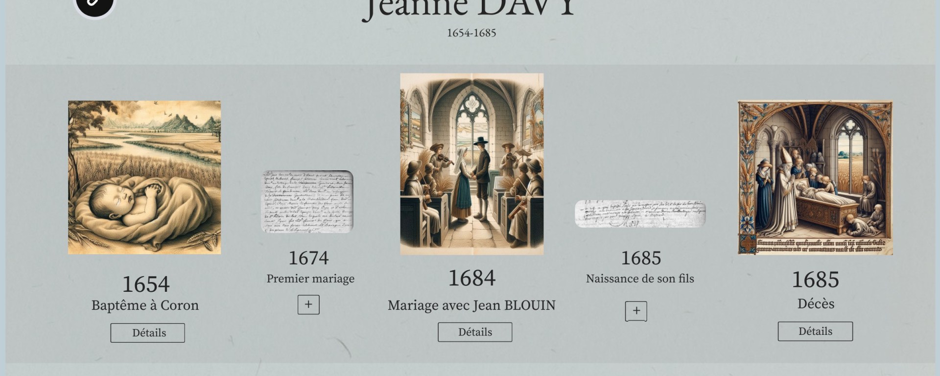 Fille de François DAVY et d’Hylairette TURPAULT, Jeanne DAVY naquit en 1654 à Coron. Vingt ans plus tard, elle épousait François CATHELINEAU qui mourut dans la neuvième année de leur mariage et avec qui elle eut deux enfants. En 1684, elle épousait en secondes noces, Jean BLOUIN, homme veuf également. Au printemps de l’année suivante, elle mit au monde un garçon, Louis, dont je descends. Hélas ! Elle mourut avant la fin de l’année, laissant seul le petit garçon avec son père… Pas pour bien longtemps, Jean BLOUIN n’attendit même pas deux mois pour se remarier !