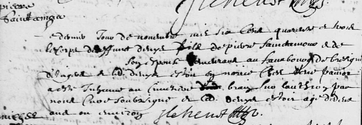 Le dernier jour de novembre mil six cent quarente et trois le corps de deffunct Denys fils de Pierre SAINCTAMOUR et de [blanc] son épouse demeurant au fauxbourg de Brésigné d’Angers et ledit Denys estoit en norrice ches René PAVIOT, a esté inhumé au cimetiere dudit Brain sur l’Authion par nous curé soubsigné et ledit Denys estoit agé de deux ans ou environ.