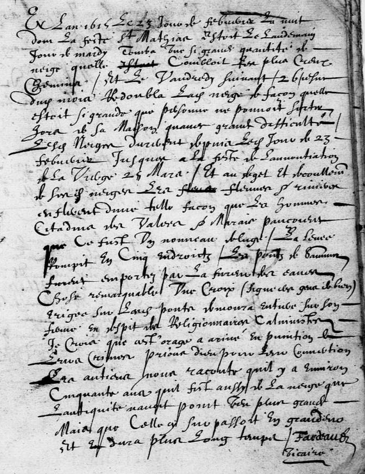 En l’an 1615, le 23 jour de febvrier la nuit dont la feite St Mathias estoit le landemain jour de mardy tomba une si grande quantité de neige qu’elle combloit les plus creux chemins. Et le vandredy suivant, 26 ème dudit mois, redoubla ladite neige de façon qu’elle estoit si grande que personne ne pouvoit sortir hors de sa maison qu’avec grande difficulté. Lesdites neiges durèrent depuis ledit jour du 23 febvrier jusqu’ à la feste de l’Annontiation de la Vierge, 25 mars. Et au degel et decoullement de lesdites neiges les fleuves et rivieres enflerent d’une telle façon que les hommes citadins des Valées et marais pançoient que ce fust un nouveau déluge. La Levée rompit en cinq endroictz. Les ponts de Saumur furent emportez par la fureur des eaux. Chose remarquable. Une croix ( Signé des gens de bien) érigée sur lesdits ponts demoura entière sur son ferre* en despit des Religionnaires Calvinistes. Je crois que cest orage a arivé en punition de leurs crimes. Prions Dieu pour leur convertion. Les antiens nous raconte qu’il y a environ cinquante ans qu’il fist aussy de la neige que l’antiquité n’avoit point veu plus grande, mais que celle cy surpassoit en grandeur et en dura plus long temps.